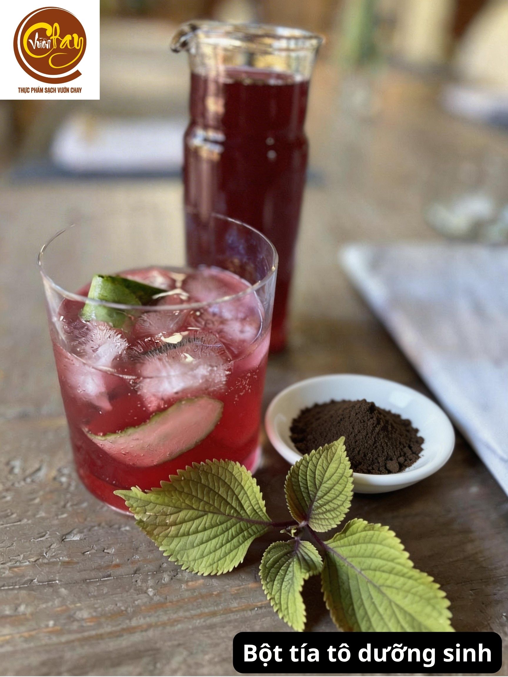 Bột tía tô dưỡng sinh là sản phẩm được làm từ lá tía tô tự nhiên, trải qua quá trình ngâm qua mơ muối lâu năm trước khi sấy và nghiền mịn, giúp cân bằng tính của thảo mộc và làm cho bột tía tô dễ uống hơn.